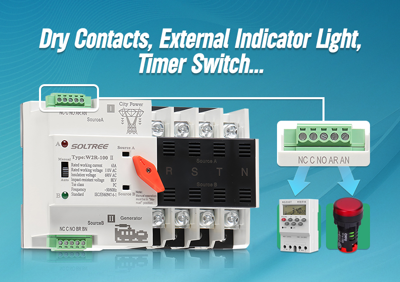 Our Automatic Transfer Switch (ATS) is equipped with dry contact signal outputs, allowing users to connect external indicator lights or alarm devices. This feature makes it easy to monitor the switch status at a glance, whether in residential, commercial, or industrial settings.