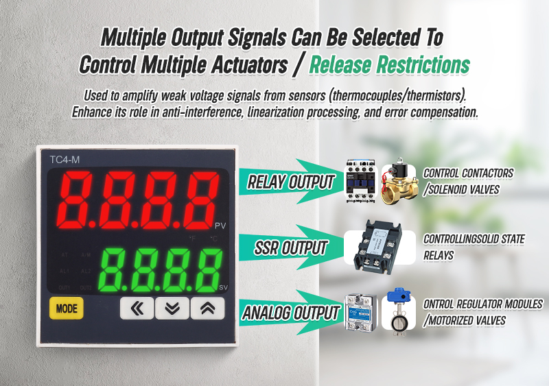 Relay, SSR, and analog outputs (4–20mA / 0–10V) to match diverse load requirements.