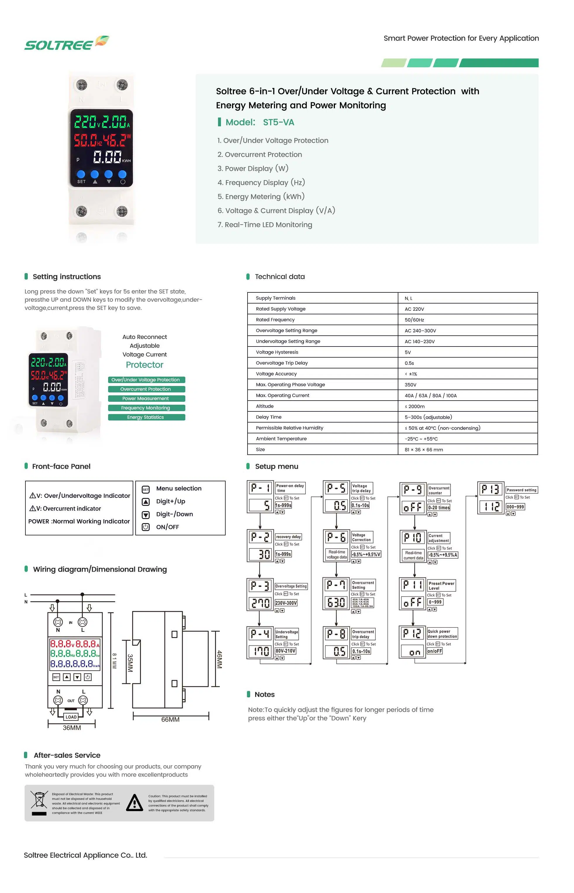 The Soltree ST5-VA 6-in-1 Over/Under Voltage & Current Protector is a multifunctional intelligent device designed to deliver comprehensive power protection and real-time energy monitoring. Integrating six key functions — voltage protection, current protection, power display, frequency monitoring, energy metering, and live parameter display — this compact unit ensures reliable, accurate, and efficient operation for residential, commercial, and industrial systems. With advanced microcontroller technology and a vivid LED display, the ST5-VA provides total electrical safety and performance visibility at a glance.